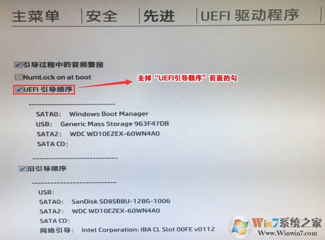 6、進入后將UEFI順序前面的勾去掉,讓機器默認為傳統(tǒng)啟動,這樣方便安裝WIN7,如下圖所示;