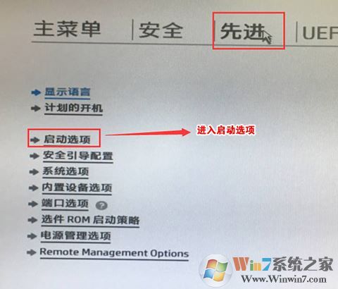 5、F10保存重啟后再次開機按ESC,然后選擇F10進入BIOS設(shè)置,將鼠標移動“先進”選項中,選擇"啟動選項"后回車進入,如下圖所示;