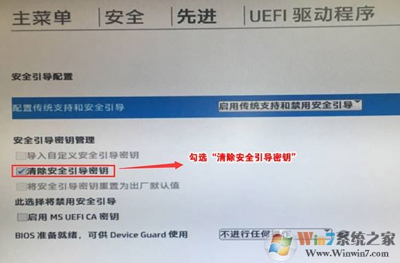 4、F10保存重啟后再次開機按ESC,然后選擇F10進入BIOS設(shè)置,將進入剛設(shè)置的地方,勾選“清除安全引導(dǎo)密鑰”,然后再次F10保存;
