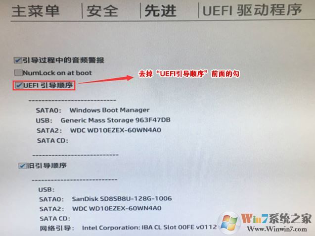 6、進入后將UEFI順序前面的勾去掉,讓機器默認(rèn)為傳統(tǒng)啟動,這樣方便安裝WIN7,如下圖所示;
