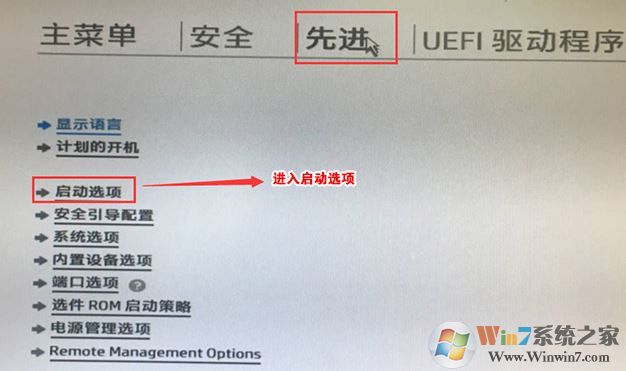 5、F10保存重啟后再次開機按ESC,然后選擇F10進入BIOS設(shè)置,將鼠標(biāo)移動“先進”選項中,選擇"啟動選項"后回車進入,如下圖所示;