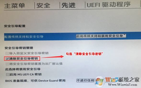 4、F10保存重啟后再次開機按ESC,然后選擇F10進入BIOS設(shè)置,將進入剛設(shè)置的地方,勾選“清除安全引導(dǎo)密鑰”,然后再次F10保存;