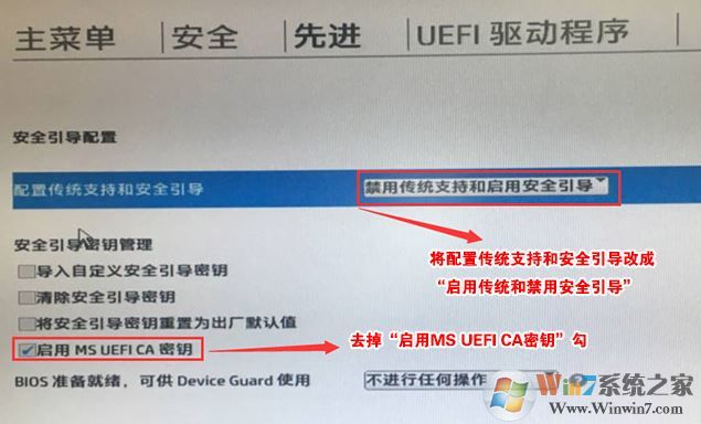 3、回車后,將配置傳統(tǒng)支持和安全引導(dǎo)設(shè)置電腦“啟用傳統(tǒng)支持和禁用安全引導(dǎo)”以及去掉“啟用MS UEFI CA密鑰”前面的勾,然后按F10保存更改;