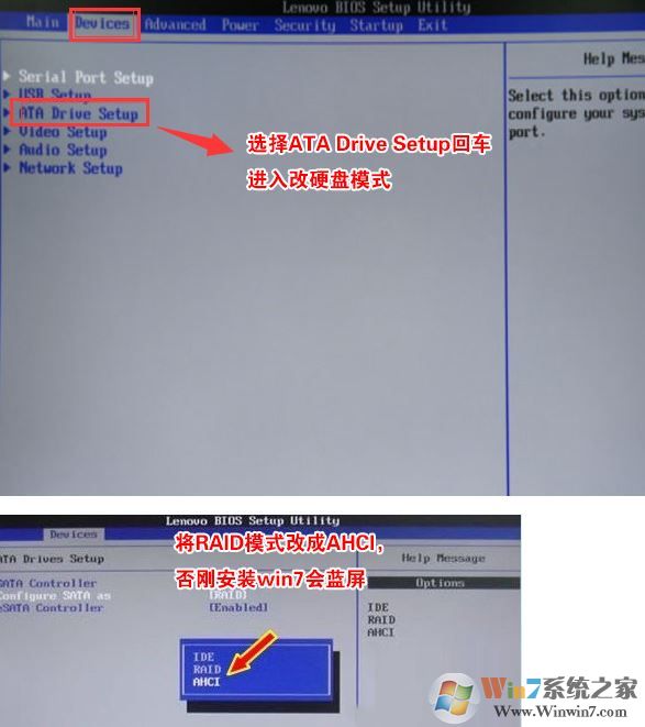 4、切將鍵盤移動Devices選項,把鍵盤移動ATA Drive Setup回車,將configure SATA as中默認的raid改成ahci模式,否則安裝win7時會出現(xiàn)0x0000007b藍屏,因為win7中沒有集成raid硬盤驅(qū)動,然后選擇F10保存設(shè)置,在彈出的選項中選擇YES,如下圖所示;