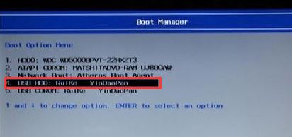 5、插入U盤啟動盤,重啟時不停的按下f12,打開Boot Manager,選擇USB HDD回車從U盤啟動,如下圖所示;