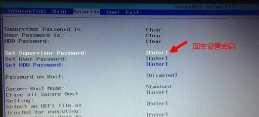 2、如果Secure Boot灰色無法設置,則轉到Security,選擇Set Supervisor Password回車設置密碼,再返回BOOT選項,將Secure BOOT默認enabled為disabled,(注:改完secure boot后再設置密碼為空即可,要不每次進BIOS都要設置)如下圖所示;
