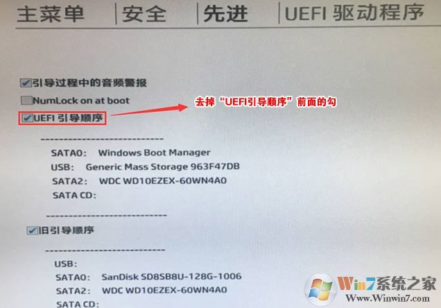 6、進(jìn)入后將UEFI順序前面的勾去掉,讓機(jī)器默認(rèn)為傳統(tǒng)啟動,這樣方便安裝WIN7,如下圖所示;