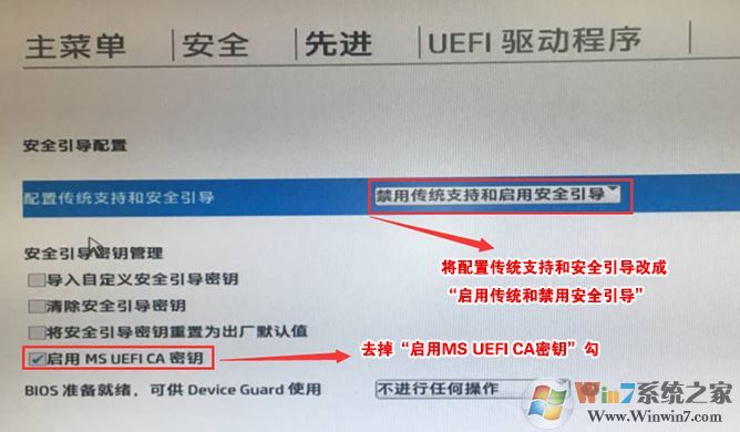 3、回車后,將配置傳統(tǒng)支持和安全引導(dǎo)設(shè)置電腦“啟用傳統(tǒng)支持和禁用安全引導(dǎo)”以及去掉“啟用MS UEFI CA密鑰”前面的勾,然后按F10保存更改;