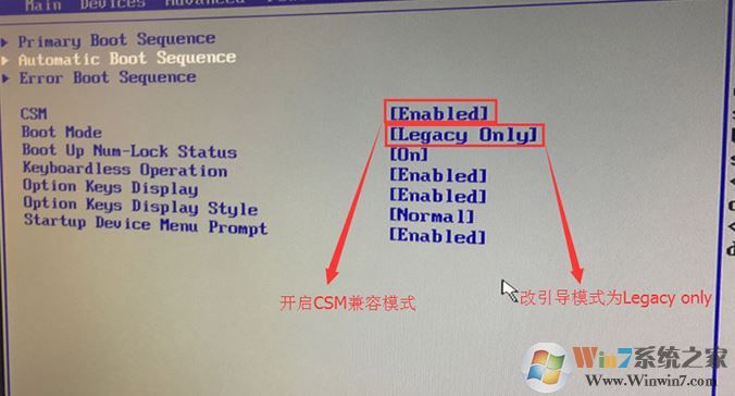 3、切換到Boot,把Boot Mode從UEFI改成Legacy only引導(dǎo)模式,再把csm默認disabled改成enabled,開啟兼容模式,選擇F10保存設(shè)置,在彈出的選項中選擇YES;
