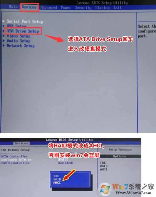 4、切將鍵盤移動Devices選項,把鍵盤移動ATA Drive Setup回車,將configure SATA as中默認的raid改成ahci模式,否則安裝win7時會出現(xiàn)0x0000007b藍屏,因為win7中沒有集成raid硬盤驅(qū)動,然后選擇F10保存設置,在彈出的選項中選擇YES,如下圖所示;
