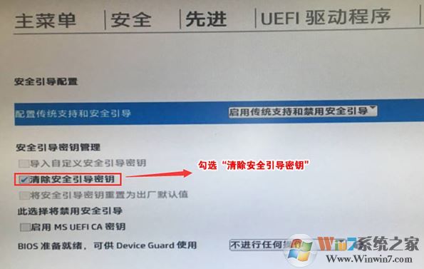 4、F10保存重啟后再次開機(jī)按ESC,然后選擇F10進(jìn)入BIOS設(shè)置,將進(jìn)入剛設(shè)置的地方,勾選“清除安全引導(dǎo)密鑰”,然后再次F10保存;