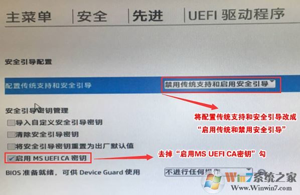 3、回車后,將配置傳統(tǒng)支持和安全引導(dǎo)設(shè)置電腦“啟用傳統(tǒng)支持和禁用安全引導(dǎo)”以及去掉“啟用MS UEFI CA密鑰”前面的勾,然后按F10保存更改;