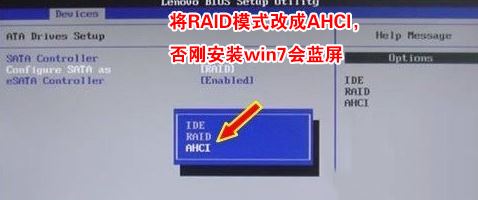 4、切將鍵盤移動(dòng)Devices選項(xiàng),把鍵盤移動(dòng)ATA Drivers setup回車,將configure SATA as中默認(rèn)的raid改成ahci模式,否則安裝win7時(shí)會(huì)出現(xiàn)0x0000007b藍(lán)屏,因?yàn)閣in7中沒有集成raid硬盤驅(qū)動(dòng),然后選擇F10保存設(shè)置,在彈出的選項(xiàng)中選擇YES,如下圖所示;