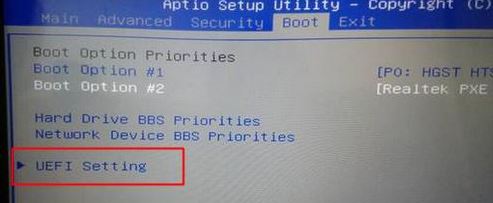 2、轉(zhuǎn)到Boot界面,選擇UEFI Setting回車;