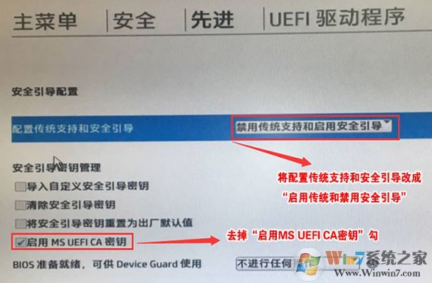 3、回車后,將配置傳統(tǒng)支持和安全引導(dǎo)設(shè)置電腦“啟用傳統(tǒng)支持和禁用安全引導(dǎo)”以及去掉“啟用MS UEFI CA密鑰”前面的勾,然后按F10保存更改;