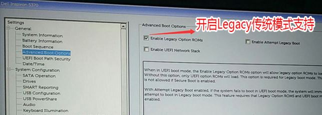 3、切換到Advanced Boot Options將右邊的Enable legacy option roms選項打勾,如下圖所示;