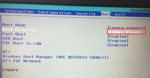 5、再把Boot Priority設(shè)置cncxm.com成Legacy First,按F10彈出窗口選擇yes回車;