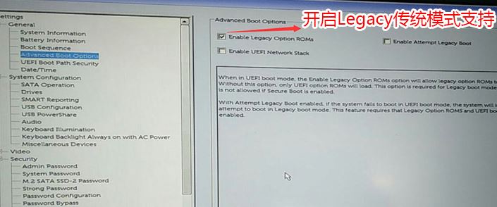 2、切換到Advanced Boot Options將右邊的Enable legacy option roms選項打勾,如下圖所示;