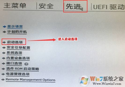 5、F10保存重啟后再次開機按ESC,然后選擇F10進入BIOS設(shè)置,將鼠標(biāo)移動“先進”選項中,選擇"啟動選項"后回車進入,如下圖所示;