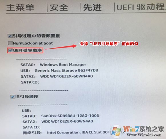 6、進(jìn)入后將UEFI順序前面的勾去掉,讓機(jī)器默認(rèn)為傳統(tǒng)啟動,這樣方便安裝WIN7,如圖: