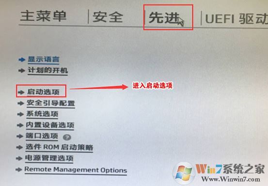 5、F10保存重啟后再次開機(jī)按ESC,然后選擇F10進(jìn)入BIOS設(shè)置,將鼠標(biāo)移動“先進(jìn)”選項中,選擇"啟動選項"后回車進(jìn)入,見下圖: