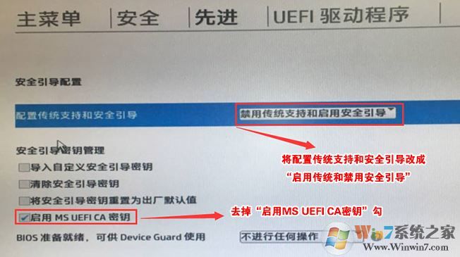 3、回車后,將配置傳統(tǒng)支持和安全引導(dǎo)設(shè)置電腦“啟用傳統(tǒng)支持和禁用安全引導(dǎo)”以及去掉“啟用MS UEFI CA密鑰”前面的勾,然后按F10保存更改,如圖: