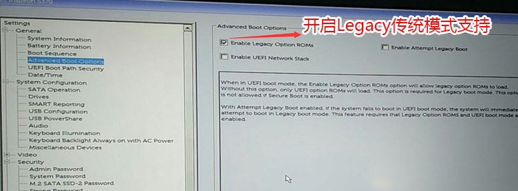 2、切換到Advanced Boot Options將右邊的Enable legacy option roms選項打勾,如下圖所示;