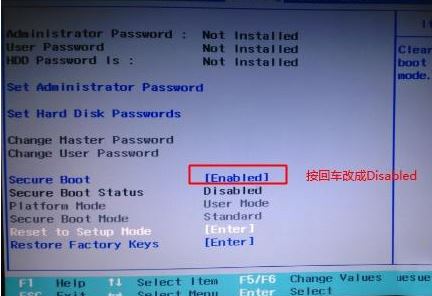 1、開機一直按F2或(FN+F2)進入BIOS,按→方向鍵切換到Security,選擇Secure Boot回車設置成Disabled,如下圖所示;