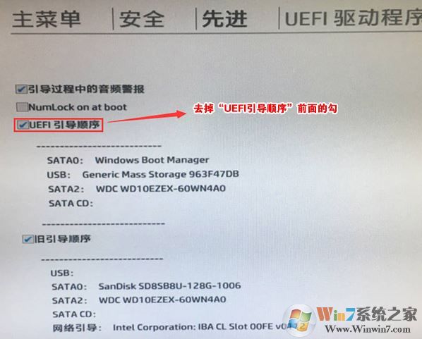 6、進(jìn)入后將UEFI順序前面的勾去掉,讓機(jī)器默認(rèn)為傳統(tǒng)啟動(dòng),這樣方便安裝WIN7,如下圖所示;