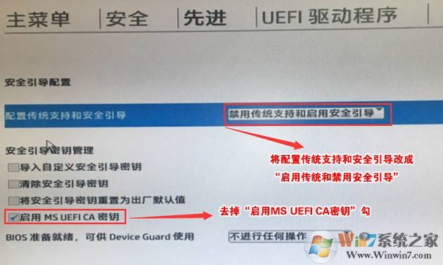 3、回車(chē)后,將配置傳統(tǒng)支持和安全引導(dǎo)設(shè)置電腦“啟用傳統(tǒng)支持和禁用安全引導(dǎo)”以及去掉“啟用MS UEFI CA密鑰”前面的勾,然后按F10保存更改;