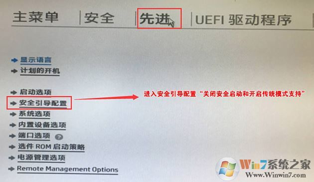2、進(jìn)入BIOS后,將移動(dòng)鍵盤(pán)到“先進(jìn)”選項(xiàng)下,選擇"安全引導(dǎo)配置",按回車(chē)鍵進(jìn)入設(shè)置;