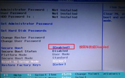 1、開機(jī)一直按F2或(FN+F2)進(jìn)入BIOS,按→方向鍵切換到Security,選擇Secure Boot回車設(shè)置成Disabled;