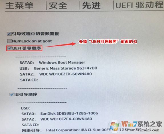 6、進入后將UEFI順序前面的勾去掉,讓機器默認為傳統(tǒng)啟動,這樣方便安裝WIN7,如圖: