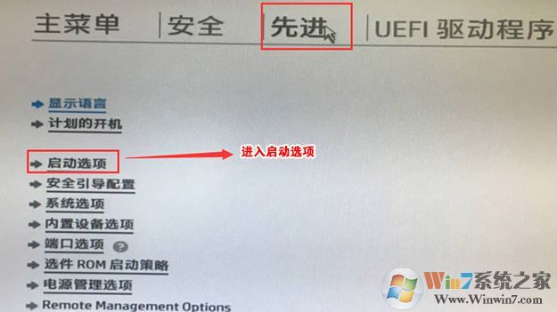 5、F10保存重啟后再次開機按ESC,然后選擇F10進入BIOS設(shè)置,將鼠標移動“先進”選項中,選擇"啟動選項"后回車進入,如圖: