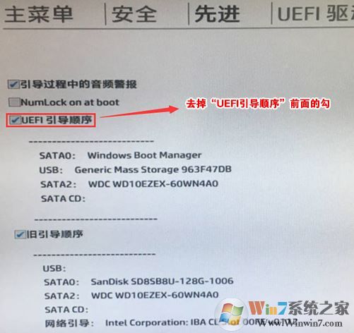 6、進入后將UEFI順序前面的勾去掉,讓機器默認為傳統(tǒng)啟動,這樣方便安裝WIN7,如下圖所示;