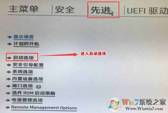 5、F10保存重啟后再次開機按ESC,然后選擇F10進入BIOS設(shè)置,將鼠標(biāo)移動“先進”選項中,選擇"啟動選項"后回車進入,如下圖所示;