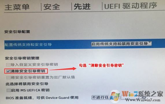 4、F10保存重啟后再次開機按ESC,然后選擇F10進入BIOS設(shè)置,將進入剛設(shè)置的地方,勾選“清除安全引導(dǎo)密鑰”,然后再次F10保存;