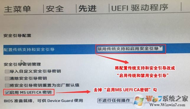 3、回車后,將配置傳統(tǒng)支持和安全引導(dǎo)設(shè)置電腦“啟用傳統(tǒng)支持和禁用安全引導(dǎo)”以及去掉“啟用MS UEFI CA密鑰”前面的勾,然后按F10保存更改;