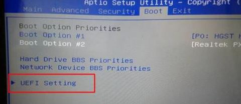 2、轉(zhuǎn)到Boot界面,選擇UEFI Setting回車;