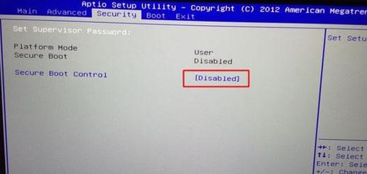 1、重啟筆記本按F2進(jìn)入BIOS設(shè)置,在Security下把Secure Boot Control設(shè)置為Disabled關(guān)閉安全啟動(dòng),如下圖所示;