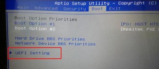 2、轉(zhuǎn)到Boot界面,選擇UEFI Setting回車;