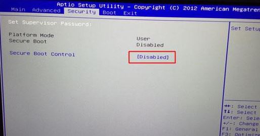 1、重啟筆記本按F2進入BIOS設(shè)置,在Security下把Secure Boot Control設(shè)置為Disabled關(guān)閉安全啟動,如下圖所示;