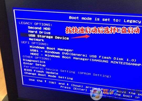 5、以上操作完成后按F10保存,選擇“YES”,插入U(xiǎn)盤啟動(dòng)盤,重啟時(shí)不停的按下f12,打開快速引導(dǎo)菜單,選擇識(shí)別的U盤啟動(dòng)回車從U盤啟動(dòng),如下圖所示;