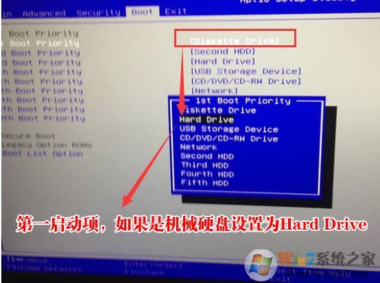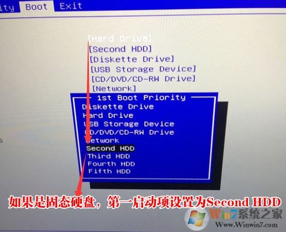 4、改完后再BOOT第一啟動(dòng)項(xiàng),如果有固態(tài)硬盤將選擇Second HDD 為第一啟動(dòng)項(xiàng),如果選擇機(jī)械盤啟動(dòng)系統(tǒng)的加就選擇Hard Devive ,如下圖所示;