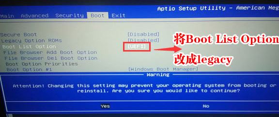 3、接著將boot list optaion的模式uefi改成legacy,改傳統(tǒng)模式,如下圖所示;