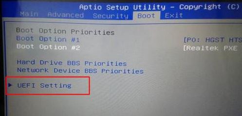 2、轉(zhuǎn)到Boot界面,選擇UEFI Setting回車;