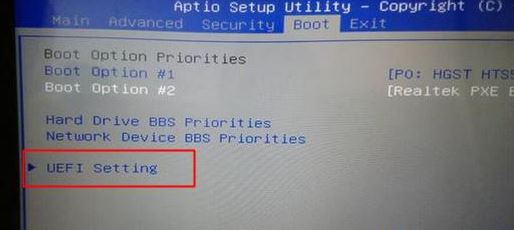 2、轉(zhuǎn)到Boot界面,選擇UEFI Setting回車;