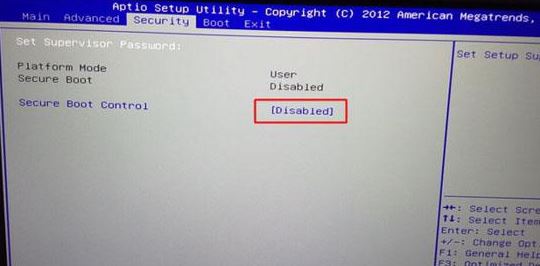 1、重啟筆記本按F2進(jìn)入BIOS設(shè)置,在Security下把Secure Boot Control設(shè)置為Disabled關(guān)閉安全啟動,安裝win7必須要關(guān)閉的一項,否則安裝后可能引導(dǎo)不了,如圖: