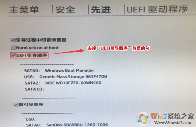 6、進(jìn)入后將UEFI順序前面的勾去掉,讓機(jī)器默認(rèn)為傳統(tǒng)啟動(dòng),這樣方便安裝WIN7,如下圖所示;