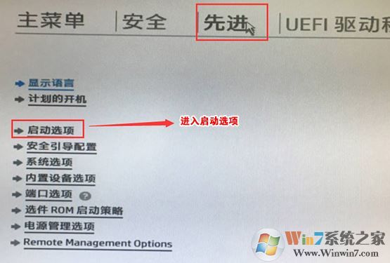 5、F10保存重啟后再次開(kāi)機(jī)按ESC,然后選擇F10進(jìn)入BIOS設(shè)置,將鼠標(biāo)移動(dòng)“先進(jìn)”選項(xiàng)中,選擇"啟動(dòng)選項(xiàng)"后回車(chē)進(jìn)入,如下圖所示;